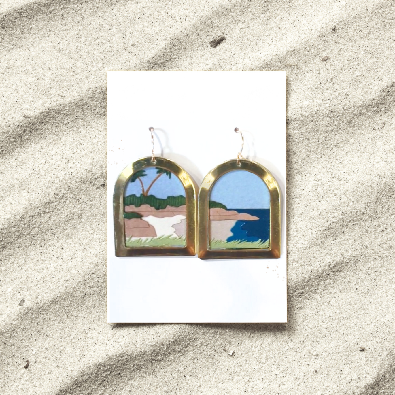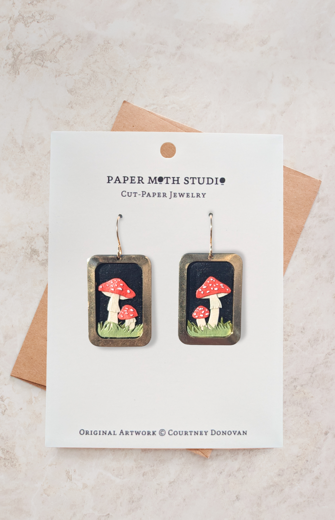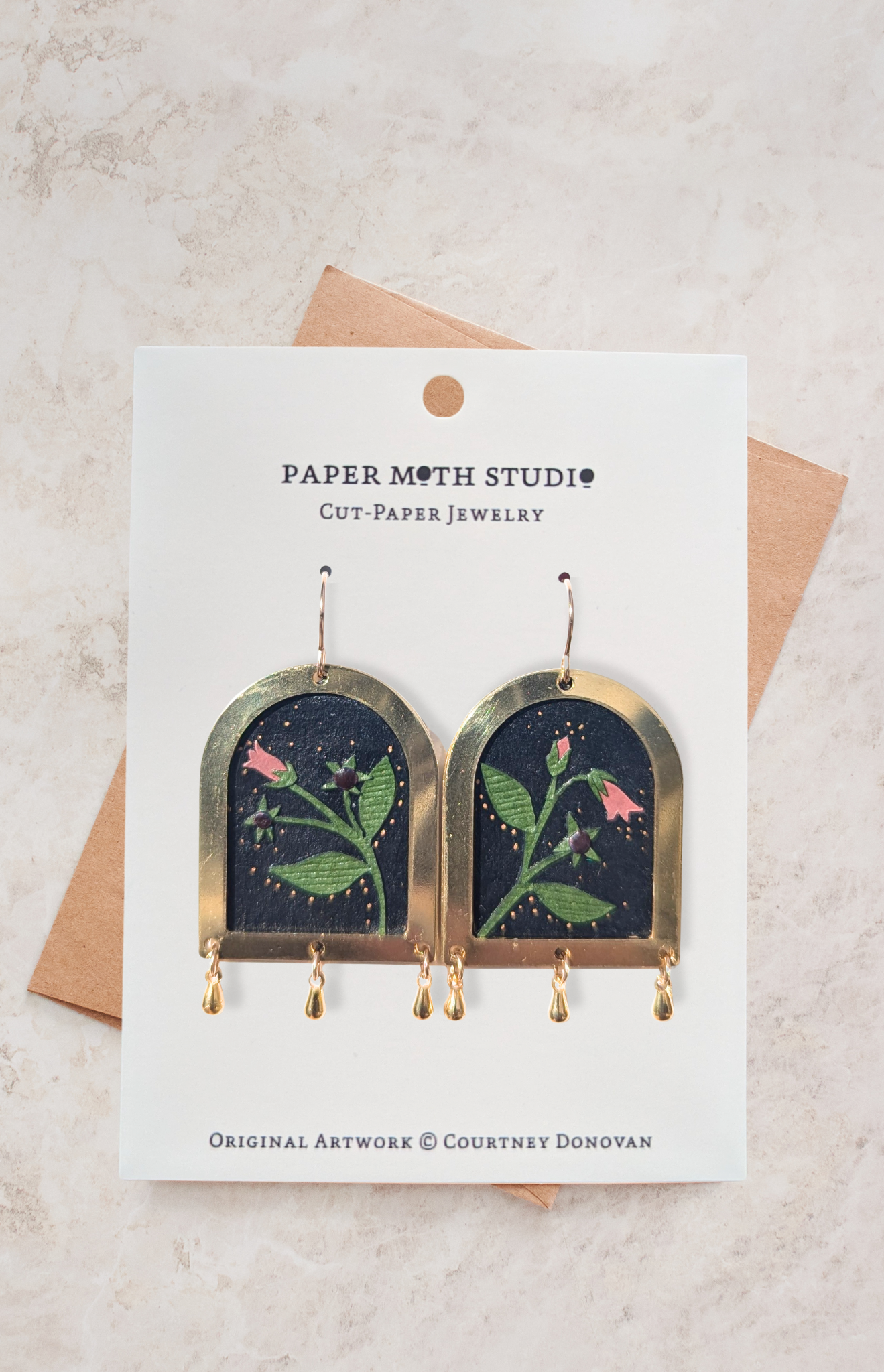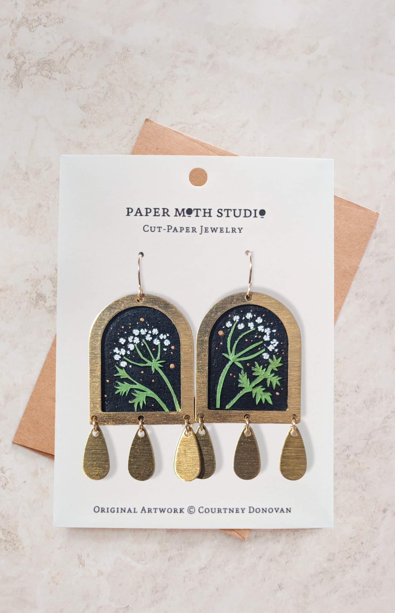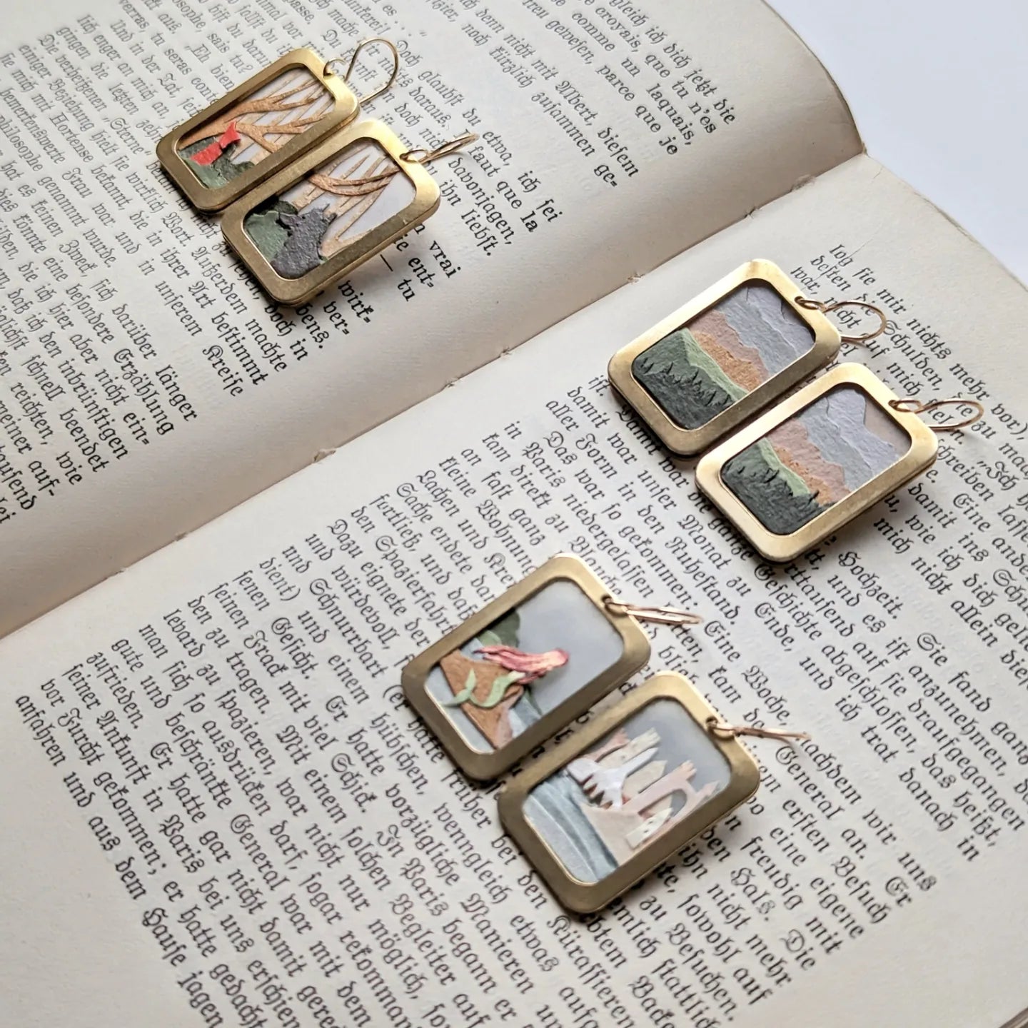 Our handcrafted earrings are meticulously designed with delicate cut-paper art encased within brass frames and completed with gold-filled ear wires for long-lasting comfort. Each piece is a personal statement, reflecting my passion for storytelling, traditional craftsmanship, and modern design. These earrings aren't just accessories; they're wearable works of art that speak to individuality and creativity. Given that each piece is handmade, please note that there will be slight variances from the design pictured.